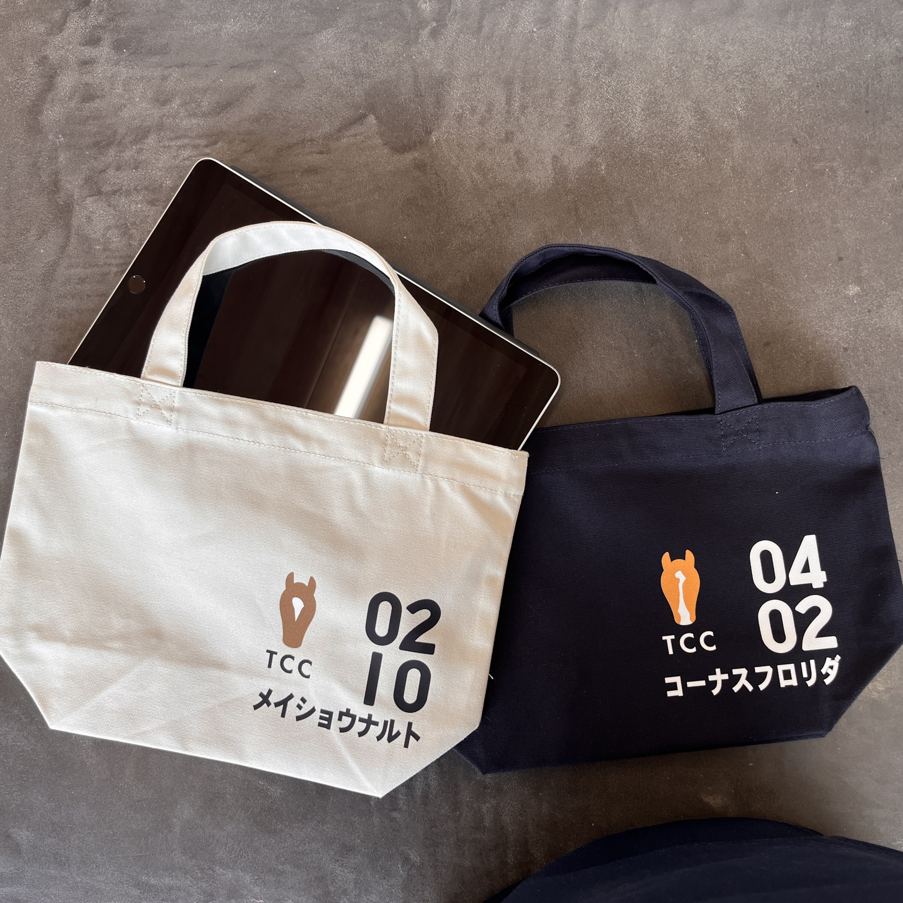 TCCから、待望の新作コットントートバッグが登場! なんと、TCCホース全頭からお気に入りのデザインを選べます♪ TCCホースのイラストは、「TCC × 賀茂神社 オリジナル絵馬」をモチーフにデザインしました。 TCC Horse " Daily Mini " は、コンパクトながらしっかりマチ付きで、ランチボックスや500mlペットボトルがすっぽり収まるサイズ感。 ペットグッズはもちろん、スマホとお財布を入れて近所のお散歩やカフェタイムにもぴったりです。 (おおきめのMLサイズはこちら→ https://store.tcc-japan.com/items/116998265 ) こちらのカラーは、さわやかなライトグレー☆ TCCのホースたちが全員集合のこちらのトート。 お気に入りの子の名前と誕生日が入ったデザインで、さりげない日常を一緒に過ごしませんか? 顔の流星もその馬に合わせてデザインされています! ■素材 : コットン ●サイズ : W300xH200xD100mm ●容量: 4L ・本商品は馬グッズを通して競走馬・引退馬支援に取り組む株式会社未来屋「馬Site」さんとのコラボ商品です。株式会社未来屋様はTCCのCSRパートナーにもなられており、TCCの活動にもご声援を頂いております。 ----------------------------------------------- 【コレクション紹介】 1. コーナスフロリダ モデル (Navy) 明るい鹿毛の馬体に、すっと通った鼻筋の模様が愛らしいコーナスフロリダをモデルに、日常使いしやすく汚れの目立ちにくいネイビーカラーで仕上げました。デザインには、彼の誕生日である4月2日を、競走馬時代の調教ゼッケン風に記しています。 ファンに愛された彼のりりしい顔立ちを、特徴的な流星も再現した可愛らしいシルエットで表現しました。 2. メイショウナルト モデル (Light gray) 強く壮快な走りと長いキャリアでファンを魅了したメイショウナルトがモデル。 どんなファッションにも合わせやすい、優しい風合いのライトグレーの生地に、彼の誕生日2月10日を調教ゼッケン風にあしらいました。 ナルトの特徴的な流星をモチーフにしたシルエットが、デザインのポイントです ■引退競走馬支援につながる TCC ONLINE STOREの収益はTCCの活動に充てられ、1点のご購入につき 100円(1,100円以上の商品)を「TCC みらい基金」に積み立てています。お買い物が引退競走馬たちの生活を支えることに繋がります。 お好きな馬のデザインを選ぶのはもちろん、色違いで揃えるのもおすすめです。 こちらの商品は、ご注文をいただいてから一つひとつ大切にお作りするため、お届けまで10日前後お時間をいただいております。 トートバッグと一緒のお出かけが、引退競走馬たちの未来を支える一歩につながります。 ※ご覧いただく端末やブラウザの環境により、実際の商品と色味が異なって見える場合がございます。あらかじめご了承ください。