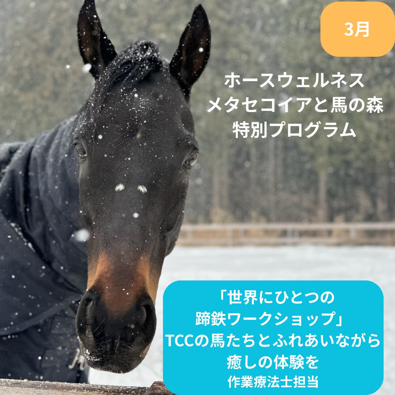 【ゲスト】3月「ホースウェルネス」メタセコイアと馬の森 特別プログラム 「世界にひとつの蹄鉄ワークショップ」 ~TCCの馬たちとふれあいながら癒しの体験を