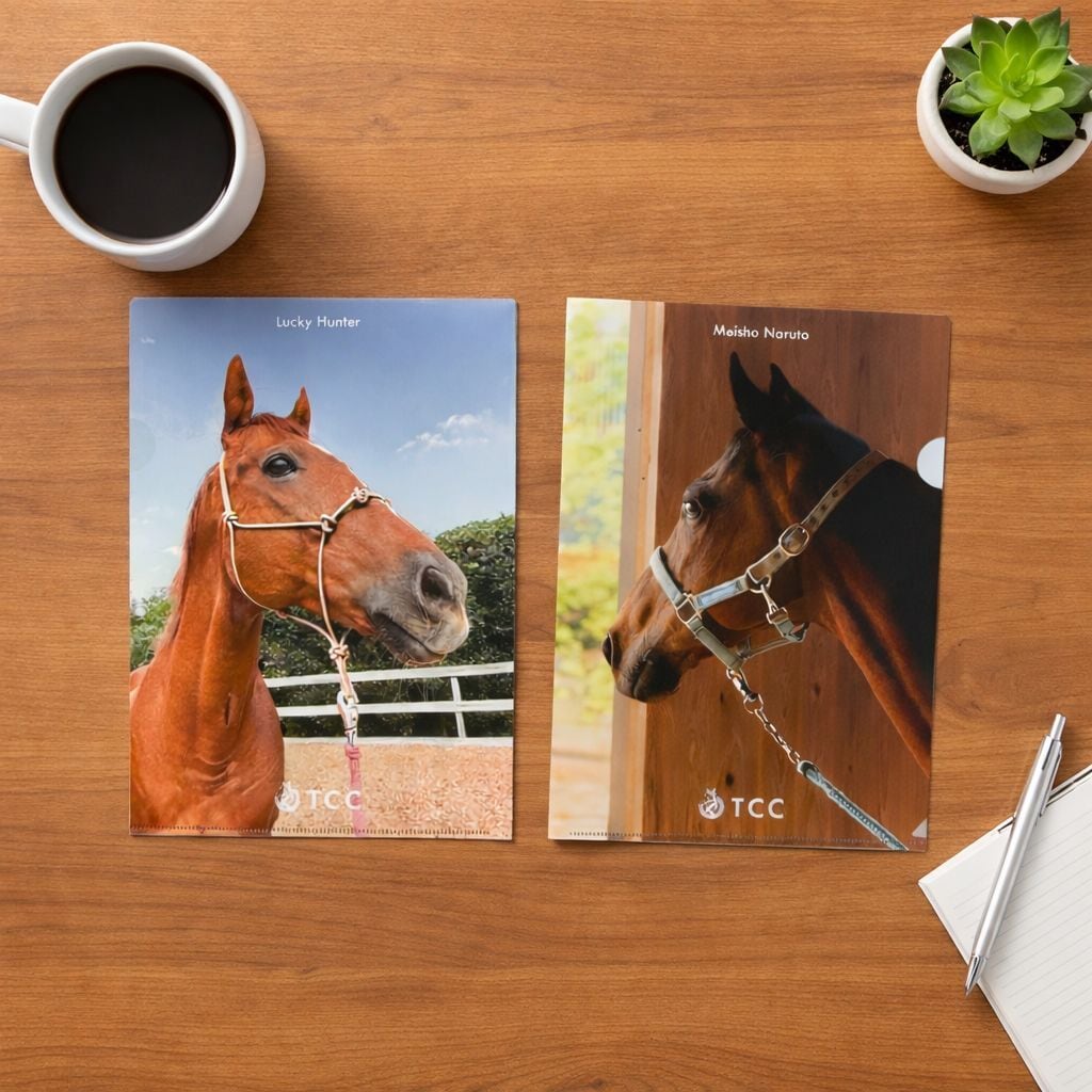 栗東TCCセラピーパークで過ごすメイショウナルトとラッキーハンターがデザインされたクリアファイルが新登場です! クールなナルトと可愛いラッキー、それぞれのキャラクターも伝わるデザインは日常に癒しを届けてくれること間違いなし! サイズ:220mm x 310mm 厚み 約0.2mm 素材:ポリプロピレン